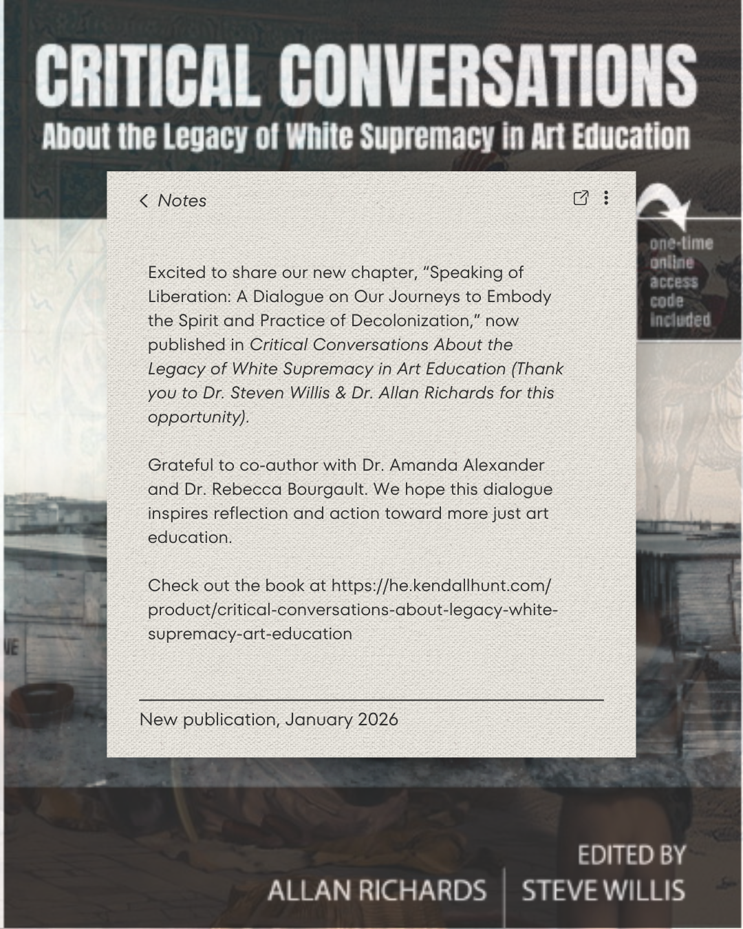 Alexander, A, Bergault, R. & Sharma, M. (2026). Speaking of liberation: A dialogue on our journeys to embody the spirit and practice of decolonization. In: Allen Richards, Steve Willis. (Eds.) Critical Conversations about Decolonizing the Legacy of White Supremacy in Art Education (pp. 55-64). Kendall Hunt.